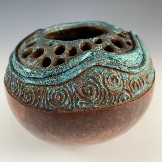 Students will learn how to carve three different patterns on their gourds and then how to apply Gourd Master metallic Aqua Shimmer dye -- so that it looks like patina.
